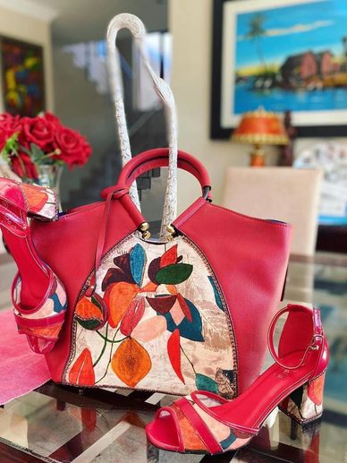 This set features sleek pointed-toe pumps and a structured handbag in deep burgundy, accented with a vibrant multicolor pattern in bold petal-like shapes. A perfect balance of sophistication and artistic flair. — inspired by the word flower, reflecting its blossoming, colorful design.