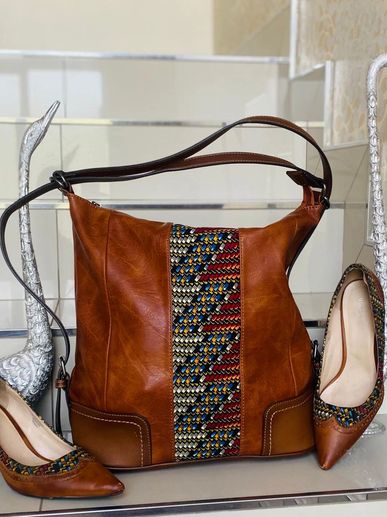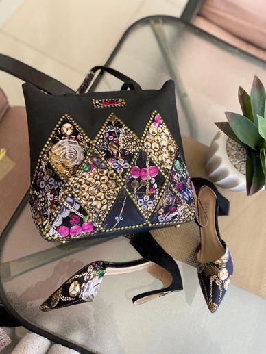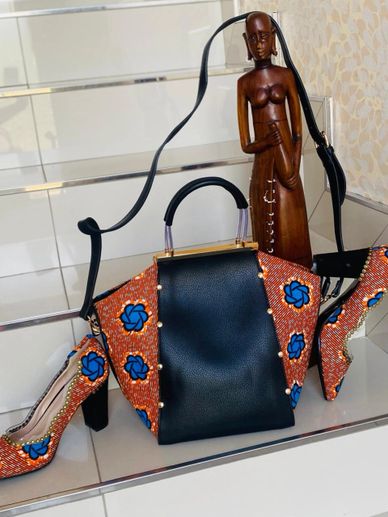 Designed in sleek black leather with vibrant orange-and-blue patterned fabric, finished with gold stud details. A bold, fashion-forward pairing that blends modern sophistication with cultural flair.