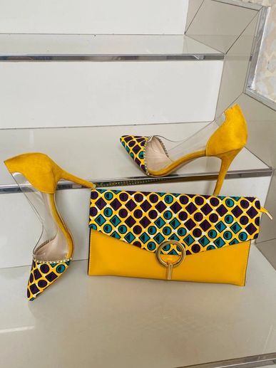 Elegant stiletto heels with a matching clutch, crafted in vibrant yellow suede and bold patterned fabric—an eye-catching statement for refined style.